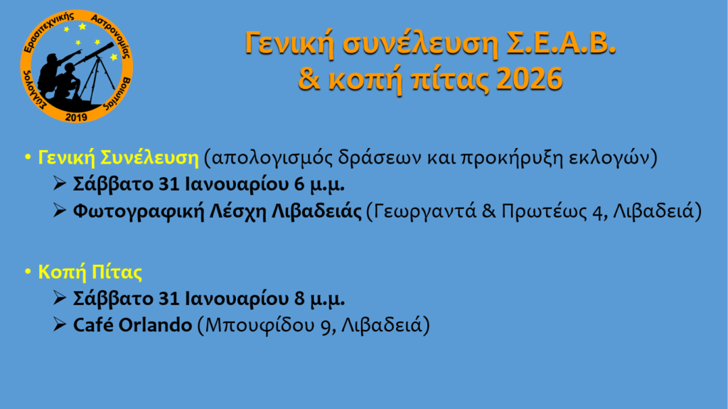 January 22, 2026 | No Comments | ΣΤΑΥΡΟΣ ΛΕΤΗΣ | 3:46 pm Share this: Click to share on Facebook (Opens in new window) Facebook Click to share on X (Opens in new window) X Click to print (Opens in new window) Print RelatedDiscover more from Viotia-Astronomy.grSubscribe to get the latest posts sent to your email. Type your email… Subscribe